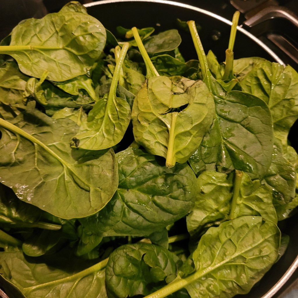 Step five: Add the whole bag of spinach and let it wilt. I like to put the lid on at this point to help the spinach wilt faster.