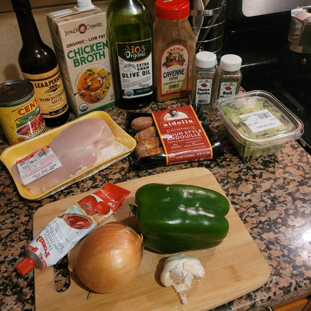Alright, first thing is the ingredients list. You got NOTHING without ingredients. As I watched over Jacques Pepin’s interview with Anthony Bourdain, one of the questions asked was who/what is more crucial to the dish… the ingredients or the chef… without a question Jacques replied, “the ingredients.” I have the honor to say it was a pleasure to be able to train Brazilian Jiu-Jitsu with Anthony Bourdain. How lucky am I?! Very! While you think that over and get your gears turnin’, here’s what you’ll need. Chicken breast, andouille sausage, bell pepper, onion, garlic, celery, can of diced tomatoes, tomato paste, olive oil, Worcestershire sauce, thyme, basil, cayenne, chicken broth, salt and pepper. NOT SHOWN ABOVE: Green onions for garnish, onion powder, veggie masala and chole masala.