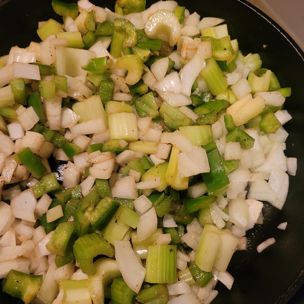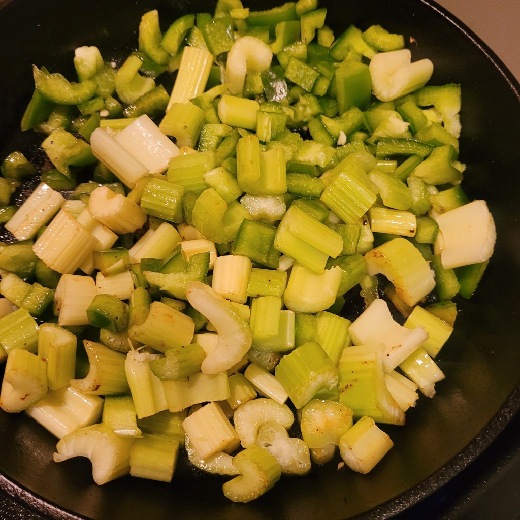Step three: In that same pan, go ahead and begin cooking the celery and bell peppers for 3 minutes. Keep an eye on them and stir lightly.