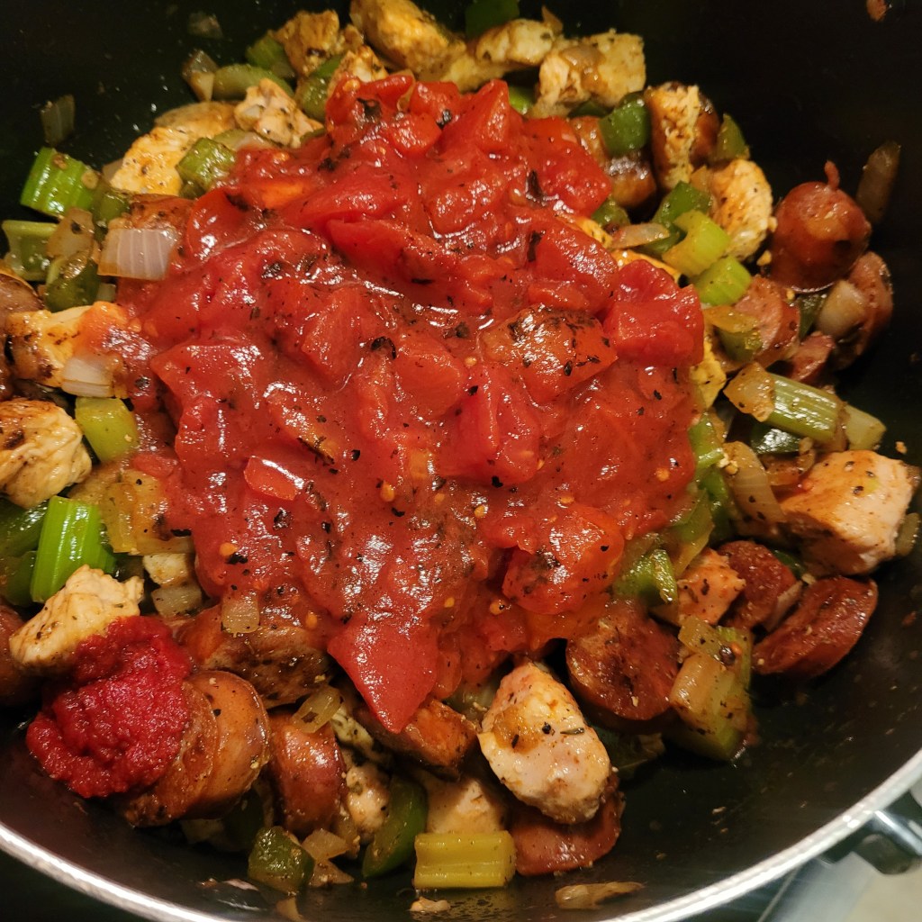 Step six: Add the can of diced tomatoes and tomato paste. Stir to combine well.