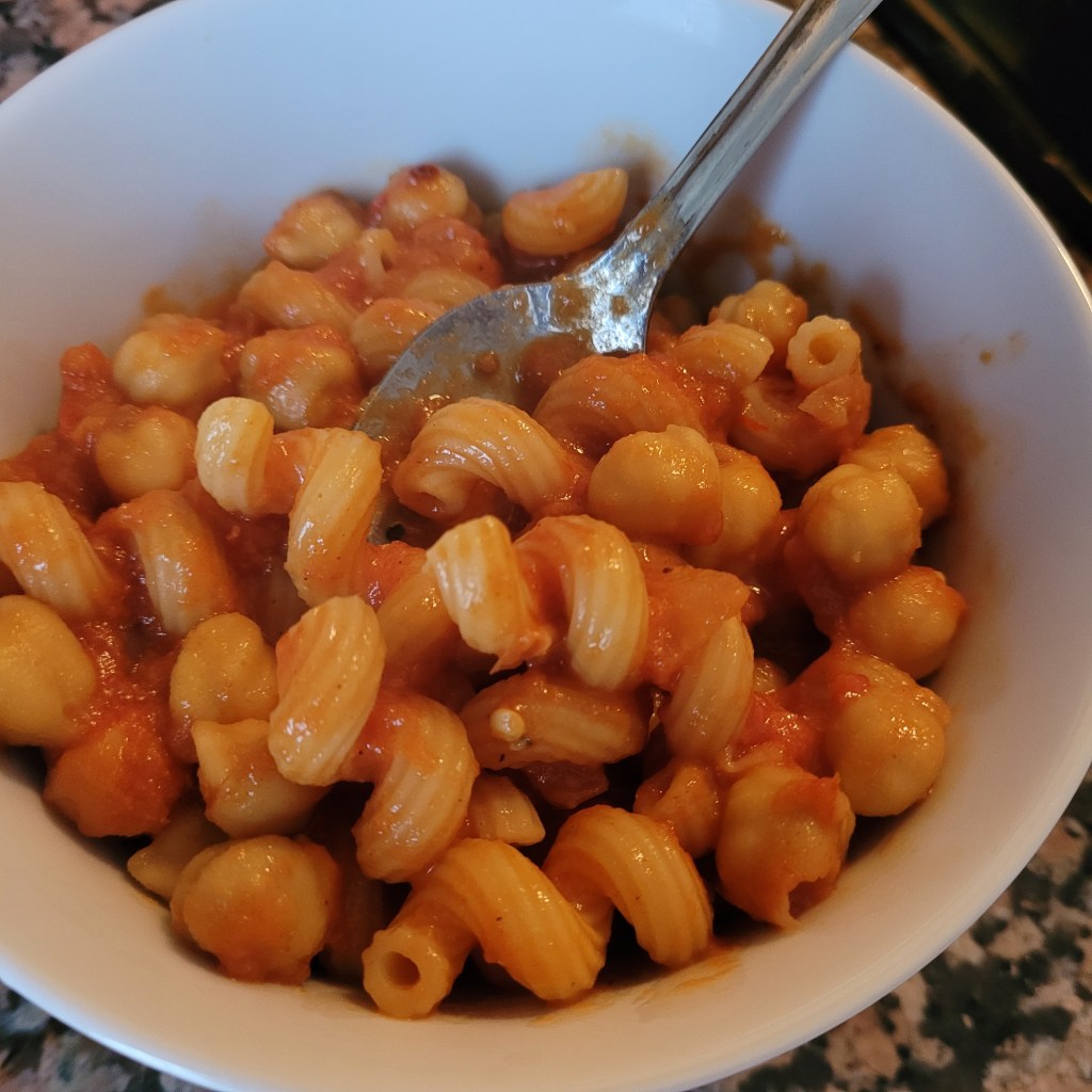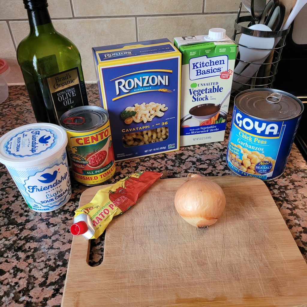 Ingredients: Chickpeas, onion, tomato paste, crushed tomatoes, sour cream, olive oil, veggie stock, pasta, paprika, onion powder, red pepper flakes, curry powder, chole masala, salt & pepper. While I did not have any garlic on me today you should be adding it to yours!