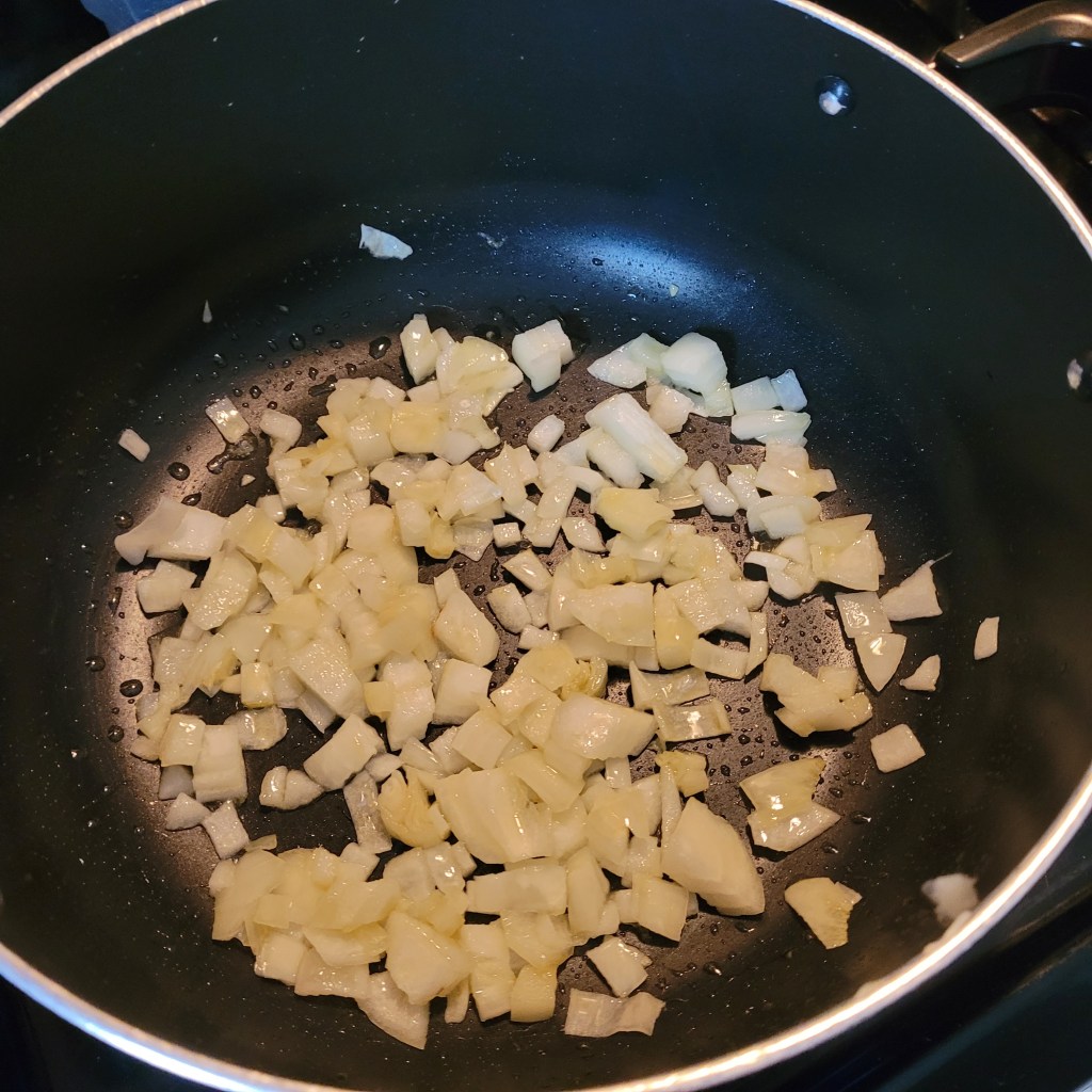 Step one: Add olive oil to a heavy bottom non-stick pot on medium-low heat. Prep the onion then add it to the pot. Cook for 3 mins. Sprinkle a little salt and pepper. While this is cooking, in a separate pot go ahead and cook the pasta according to the box instructions.