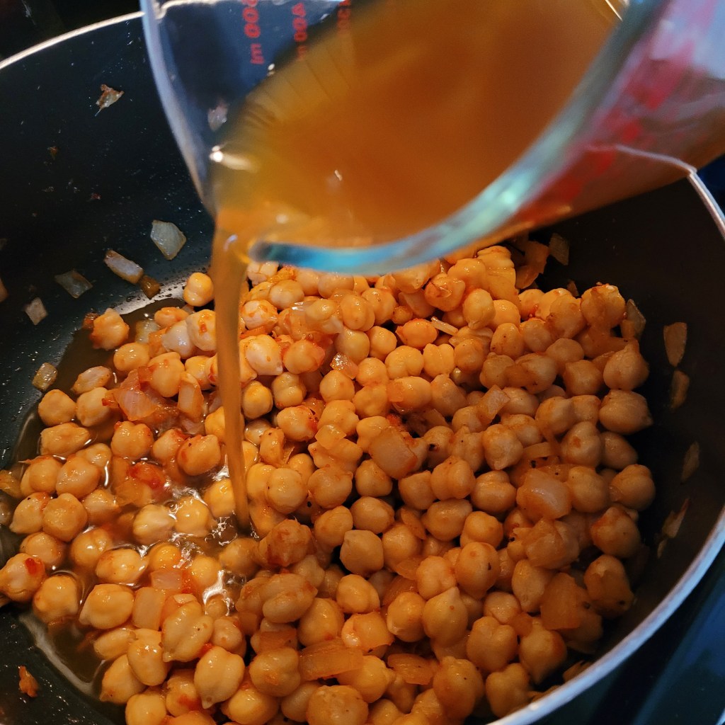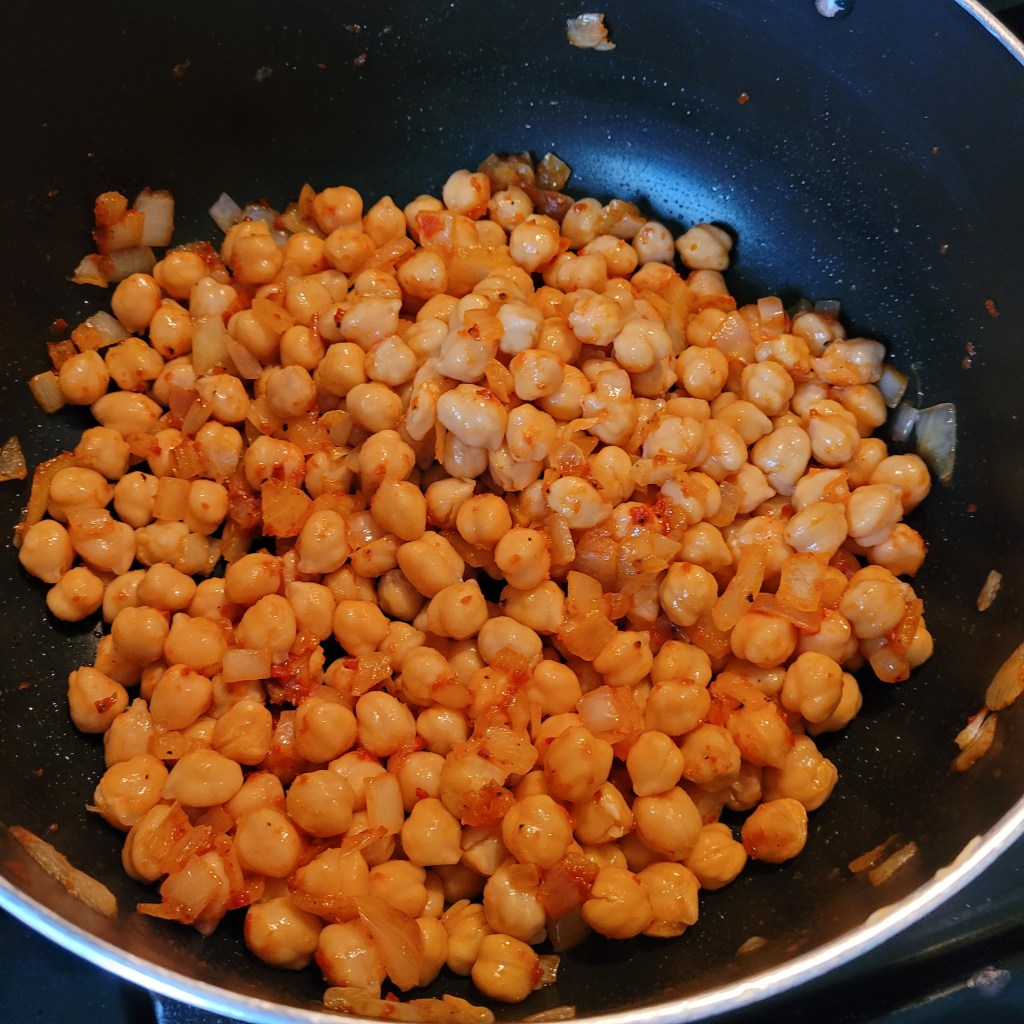 Step two: Add the drained chickpeas, onion powder and tomato paste. Cook for another 3 minutes.