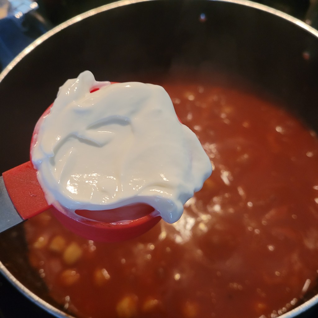 Step five: Add the sour cream and stir. You can either use sour cream or coconut milk. I used a light version of the sour cream so it’s less calories and less cholesterol. Make sure to give it a taste! Lastly add in the boiled pasta and stir everything together.