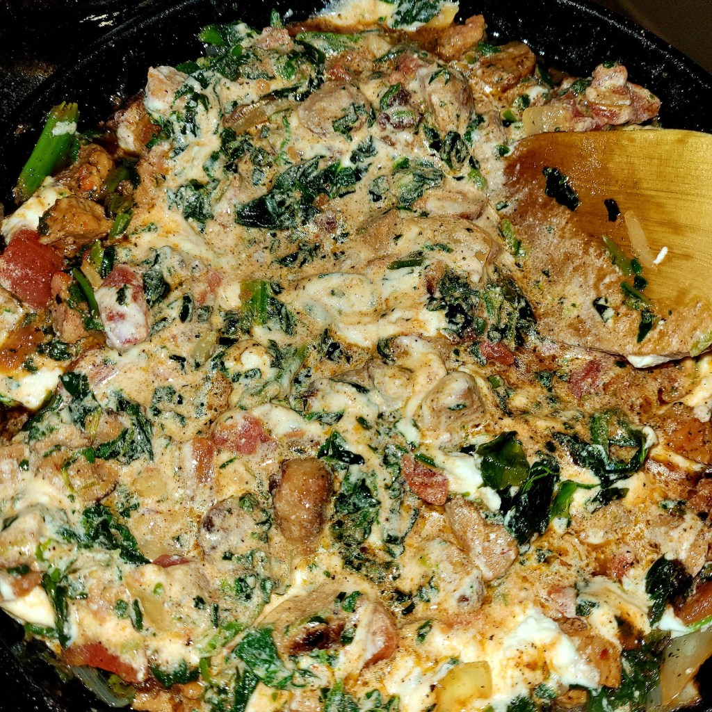 Step Four: *Pre-heat the oven to 350 degrees* Now that all of the sausage has been removed from the pan and set aside. Go ahead and add the diced onion and garlic in to cook for 3 mins. No need to add more olive oil because the fat left in the pan from the sausage will be very useful. Once the onion is cooked, put the sausage back in along with the diced tomatoes and frozen/fresh spinach. Cook everything until the spinach is wilted in and the liquid is reduced by at least half. I would give it about 8-10 mins on medium low. This is also the time you want to season with salt & pepper. I also used a lil adobo and paprika.