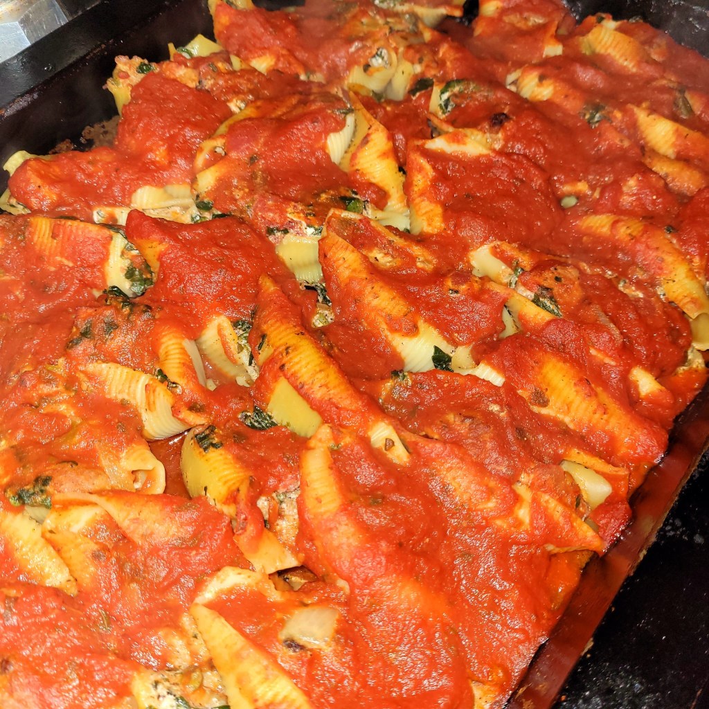 Step Six: Okay the last step is going to be assembly. Your oven should be heated by now as I wrote in “Step Four.” Drizzle some olive oil into your baking sheet pan and spread it with your hands so it’s coated evenly. Now scoop some stuffing into each shell and line them up. Then pour over some marinara on top and spread evenly. Bake for 18-20 minutes. You can sprinkle some mozzarella if you like but I opted out. And that’s it, a delicious healthy and filling dinner with lots of left overs!!