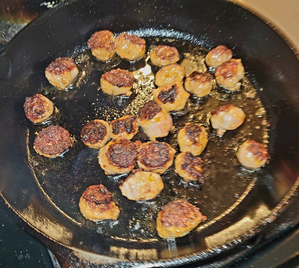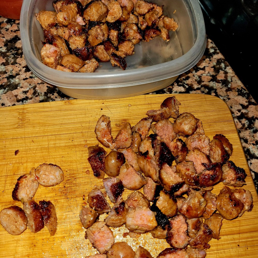 Step Three: Once some of the sausage has cooked, I transfer them into a container and continue to cook the remaining portion. While the rest are still cooking, I sliced up the ones that are done and this will make the dish more suitable so that they are smaller bites. And it’s ok if you see some pink right now because we’re going to place them back into the pan in a bit.