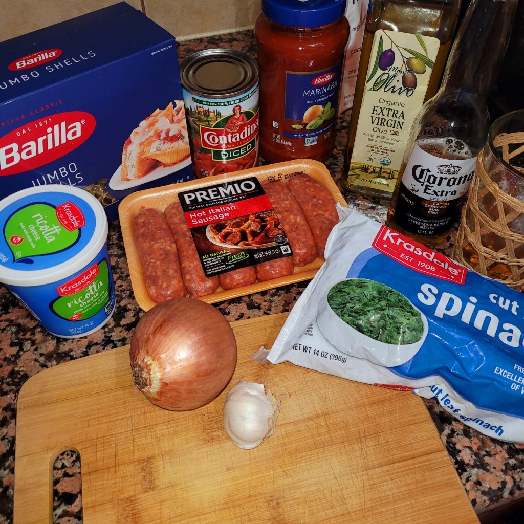 Ingredients: Italian sausage, medium yellow onion, garlic, olive oil, ricotta, jumbo shells, diced can tomatoes, marinara sauce, frozen or fresh spinach. The bottle of Corona is just for me though lol it’s for prep work 😉 If you are using frozen spinach, let the bag sit out on the counter for a while to defrost. The only prep work will be to slice up the sausage links, the onion and garlic.