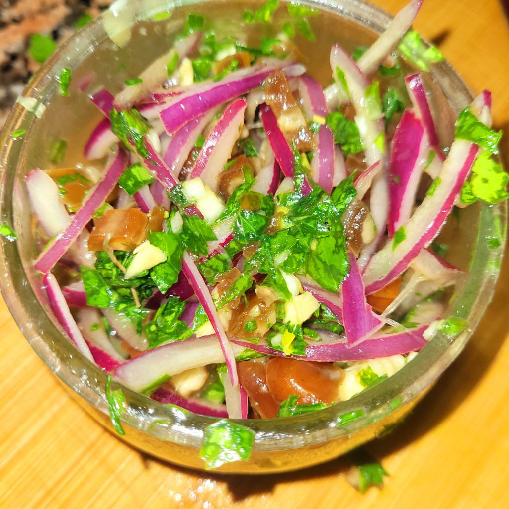 Step Two: Thinly slice the red onion. I only used about 1/4 of a medium sized red onion. Chop up the garlic and dates into teeny tiny pieces. I do like the dates chopped slightly larger than the garlic for this recipe. Then roll up a handful of the cilantro and julienne it. Add in the squeezed lime juice, maple syrup, red wine vinegar, olive oil and a bit of salt. Mix it all together and set aside in the fridge.
