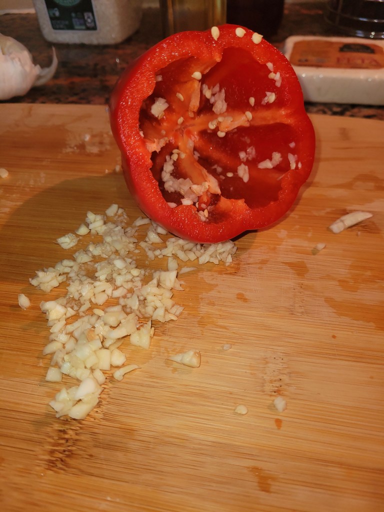 Step Two: Mince 3 – 4 cloves of garlic. Spread the minced garlic all through out the sliced peppers using your fingers. And also rub some olive oil on the outside and bottom of the peppers. Sprinkle lightly with salt and pepper. Place into oven to bake for 25 minutes.