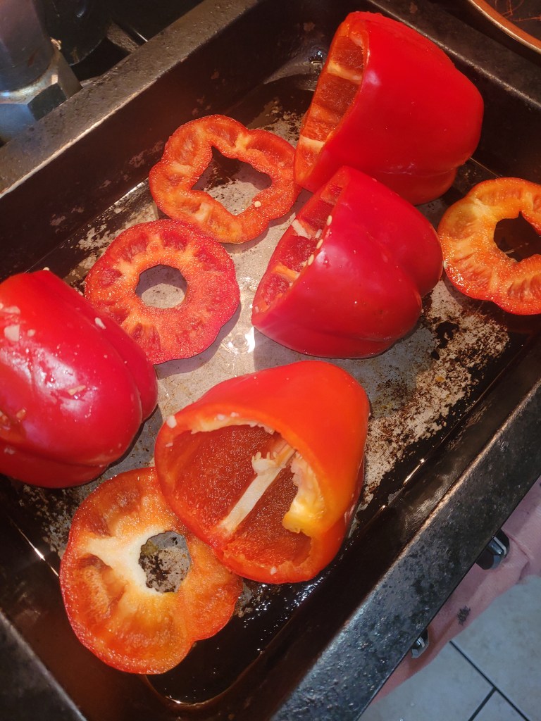 Step One: Pre-heat your oven to 400 F. Drizzle some olive oil in the pan. Wash the peppers and slice like so, removing the green stems. I keep the tops of the peppers and bake them as well. You can serve the peppers with or without the tops, up to you.