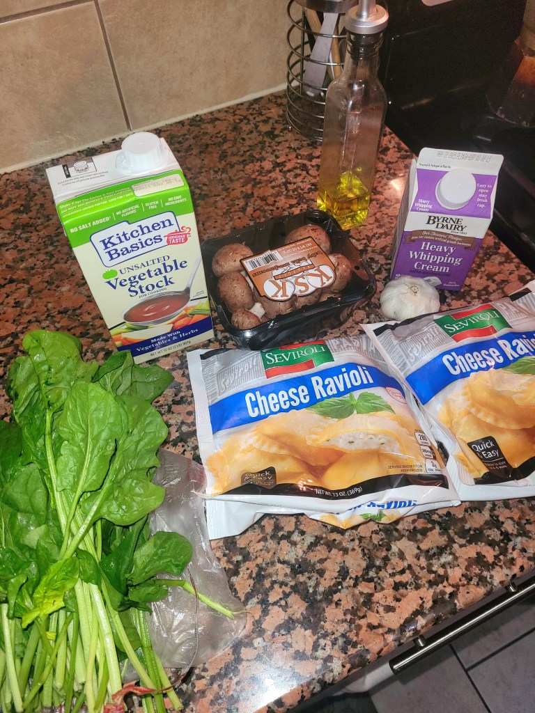 Ingredients: Pre-made ravioli, veggie stock, mushrooms, heavy whipping cream, garlic, fresh spinach and olive oil.