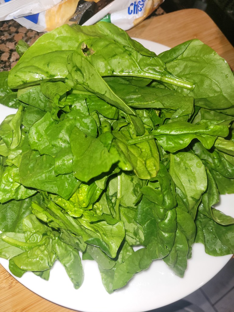 Step Two: Give the spinach a little haircut by cutting off the stems. Leave as much of the leaves as possible. Then rinse off the spinach in a separate bowl of water. Dunk them in and shake off any sand/dirt. Do this part twice to be thorough.