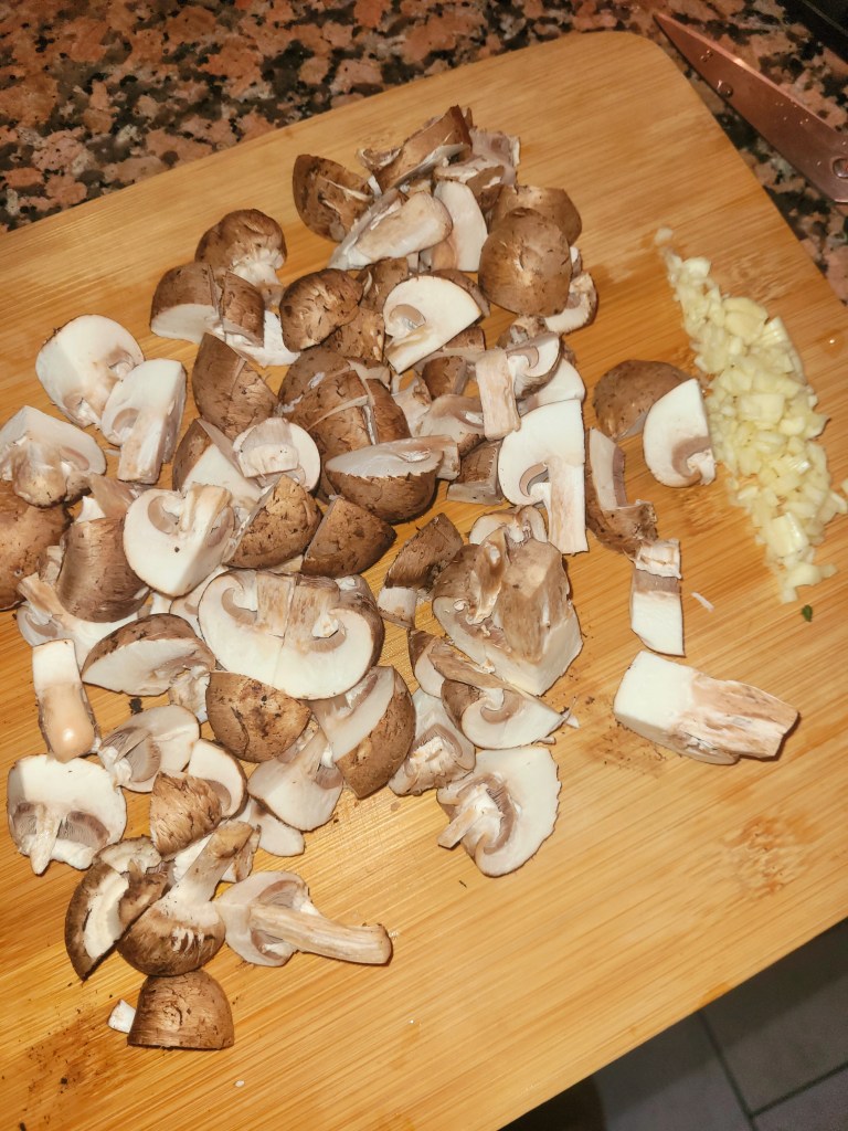 Step One: Bring a pot of water to boil and season with salt. While the water is boiling, mince the garlic and chop the mushrooms.