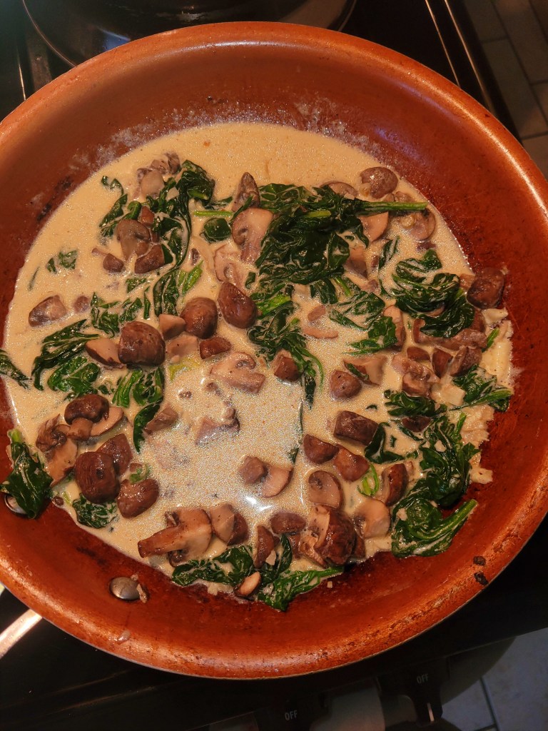 Step Four: Cook the spinach in a non-stick skillet with a drizzle of olive oil. Cook for about 5-8 minutes on medium low heat. Season with salt and pepper. Do the same process for the mushrooms but separately.